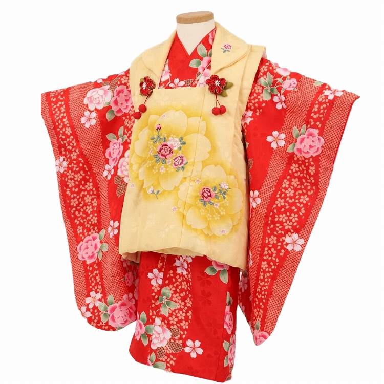 七五三 着物 3歳 レンタル 女の子 被布着物8点セット 生成りと赤の染め分けにレトロ八重菊 レトロ Re 753 G3 102 なでしこレンタル 通販 Yahoo ショッピング